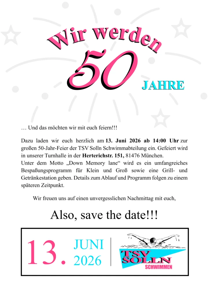 50 Jahre Schwimmabteilung beim TSV Solln, wenn das kein Grund zum Feiern ist! Wir laden euch herzlich ein mit uns dieses Jubiläum zu feiern, und zwar am 13. Juni ab 14:00 Uhr. Alle Infos dazu findet ihr auf unserem Flyer: Vorheriger Beitrag Sollner Erfolg bei den Kreismeisterschaften 2024